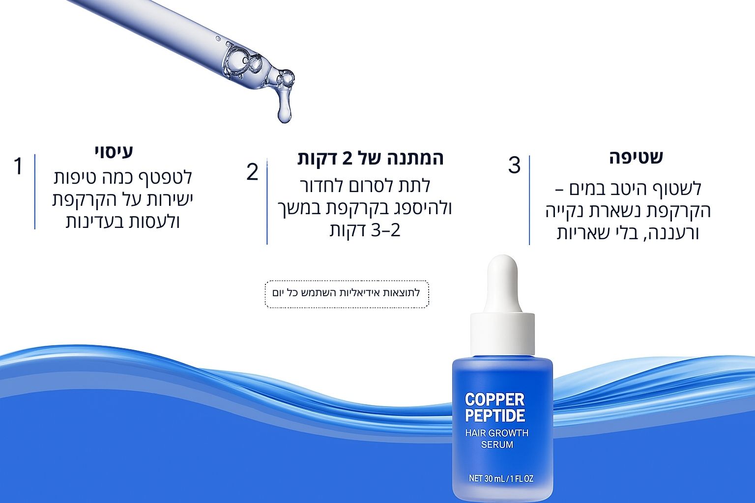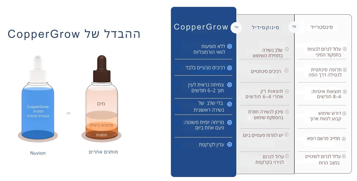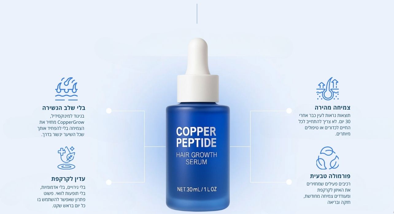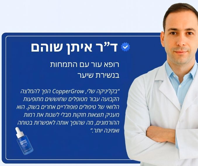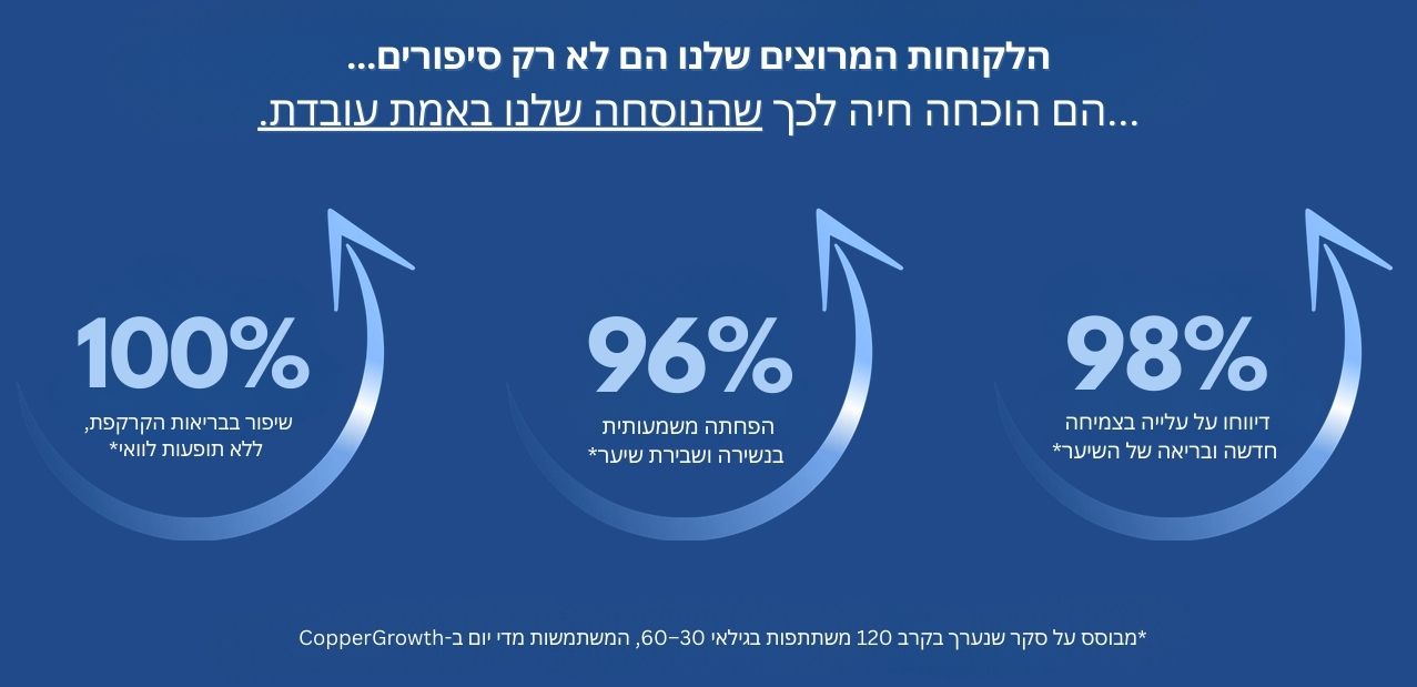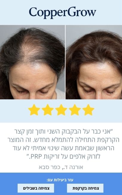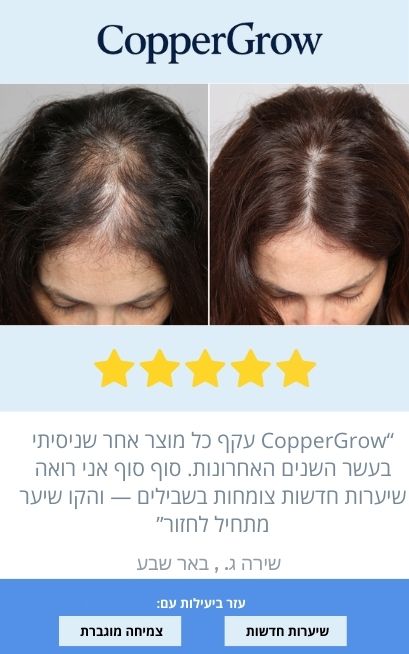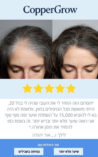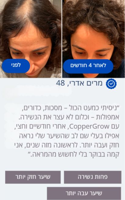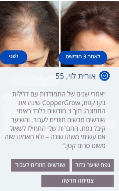 עם CopperGrow את סוף סוף חוזרת לאהוב את מה שאת רואה במראה – רואה שיערות תינוק חדשות צומחות, הקוקו מתמלא, והראש כבר לא מתכסה כל בוקר בשערות שנשרו.