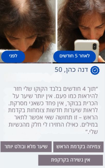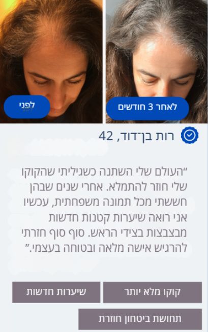 תשכחי מהמבוכה שבמפגש עם חברות כשמישהו לוחש: “רואים לך קרחות…”, מהפחד שכל החיים תצטרכי למרוח טיפות שלא עוזרות, או לבזבז עוד אלפי שקלים על טיפולים כואבים שלא עושים כלום.